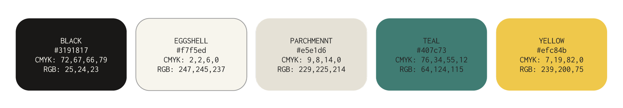 Parchment & Eggshell Warm, light neutrals that create calm and clarity. These tones soften print and environmental graphics, making the brand feel modern and inviting.
